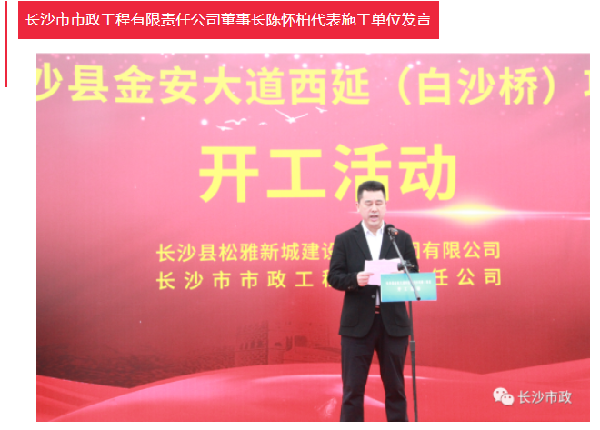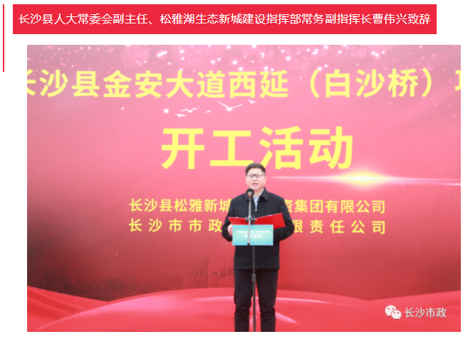 4月19日上午,長沙縣金安大道(含白沙河橋)西延項(xiàng)目開工活動隆重舉行。長沙市人民政府副秘書長張躍先,長沙縣委副書記、縣長、松雅湖生態(tài)新城建設(shè)指揮部指揮長陳永高,松雅湖生態(tài)新城建設(shè)指揮部常務(wù)副指揮長曹偉興,長沙市市政工程有限責(zé)任公司董事長陳懷柏出席活動。長沙縣松雅湖生態(tài)新城發(fā)展中心書記羅衛(wèi)滋主持開工活動。
